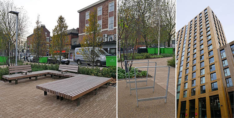 考虑到场地的严格限制,室外空间被限制在建筑前面的一个小三角形土地上——实际上是一个口袋公园,尊重并编织到现有的当地街道布局。当地景观建筑事务所Re-Form设计了一个有吸引力的、亲密的、带有种植边界的空间。为了保持整个开发项目的大胆和当代设计,Re-Form选择了furniture的RailRoad座椅,delta支持模块连接到定制的双宽平台,创造了一个不同寻常的整体座位安排。座位支架的三角形式呼应了Ribbon循环支架的选择,采用了坚固的镀锌表面处理,最大限度地提高了长期耐用性。