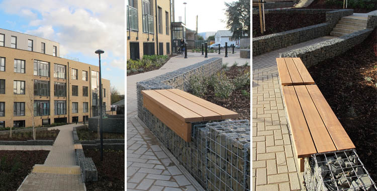 有两个住宅块面对着一个共享的庭院,包括广阔的种植床和道路和台阶网络。石笼被用作挡土结构,以适应场地上不断变化的水平,并保护路径的侧面和种植床。Furnitubes”拉帕的长椅上平台已经被应用在许多格宾墙,为居民提供经济实惠和舒适的座位。